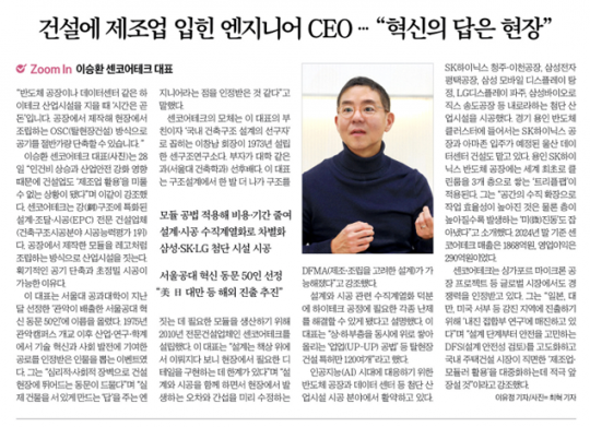 최근 대한민국을 대표하는 경제지인 한국경제신문에 우리 센코어테크 이승환 대표의 인터뷰 기사가 비중 있게 다뤄졌습니다.이번 기사에서는 엔지니어 출신 CEO로서 제조업의 합리적인 사고방식과 풍부한 현장 경험을 건설 산업에 과감히 접목해 온 이승환 대표의 진취적인 행보가 집중 조명되었습니다.기사에서는 센코어테크의 독보적인 기술력이 반도체 공장, 데이터센터, 대형 산업시설 등 첨단 시공 현장에서 거두고 있는 실질적인 성과들을 핵심 사례로 소개하였습니다.DfMA, OSC, 모듈러 구조 시스템을 기반으로 한 공법 도입하였으며,공장 선제작 후 현장 조립 방식을 통해 공기 단축과 공사비 절감은 물론, 품질 및 안전성 향상이라는 세 마리 토끼를 동시에 잡았다는 평가입니다.또한, 센코어테크가 그려나갈 차세대 건설 산업의 청사진도 함께 제시되었습니다.우리 그룹은 앞으로도 표준화된 프리패브(Pre-fab) 구조 시스템을 더욱 고도화하고, 설계-제조-시공의 완전한 수직 통합을 이뤄낼 것입니다.특히 AI 기반 엔지니어링 및 자동화 기술을 통해 차세대 대형 산업 프로젝트를 선도해 나갈 만반의 준비를 갖추고 있음을 알렸습니다.이러한 끊임없는 도전과 공로를 인정받아, 이승환 대표는 ‘서울대학교 혁신 동문 50인’에 선정되는 영예를 안았습니다.이는 기술력을 실제 산업 성과로 구현해낸 혁신 사례로서 대외적인 공식 평가를 받은 것이기에 더욱 뜻깊습니다.이번 성과는 개인의 영예를 넘어, 현장에서 검증된 엔지니어 중심의 혁신이 곧 건설과 제조 산업의 미래 경쟁력임을 보여주는 상징적인 이정표가 될 것입니다.